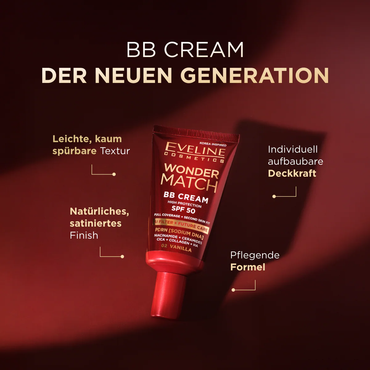 Wonder Match BB Cream LSF 50 lässt deine Haut schon kurz nach dem Auftragen frisch, glatt und natürlich aussehen. Die leichte Formel kaschiert Unregelmäßigkeiten, gleicht den Teint aus und unterstreicht den gesunden Glow der Haut – während sie gleichzeitig einen hohen Sonnenschutz bietet.