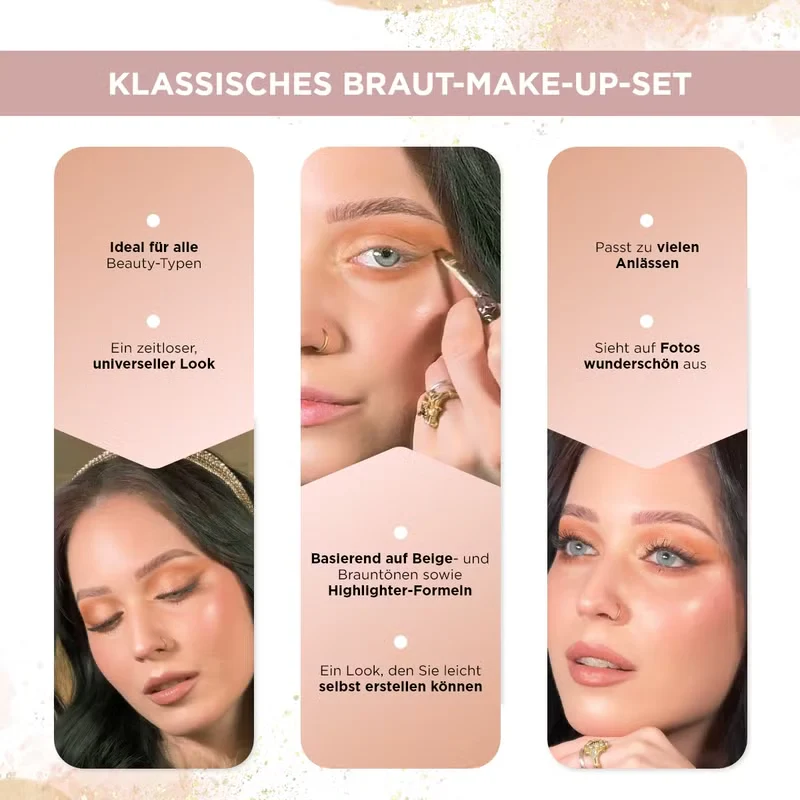 Sie suchen ein Set, mit dem Sie ein zeitloses und wunderschönes Braut-Make-up kreieren können? Hier ist es! Das "Klassische Braut-Make-up"-Set ist ideal für jeden Typ von Schönheit und vereint die Eleganz von Beige, Braun und leuchtenden Akzenten. Mit diesem Set zaubern Sie einen perfekten Look, der nicht nur auf Hochzeiten, sondern bei jeder festlichen Gelegenheit begeistern wird. Das Set beinhaltet Foundation, Rouge, Lidschattenpalette mit 12 Farben, Mascara und flüssigen Lippenstift.
