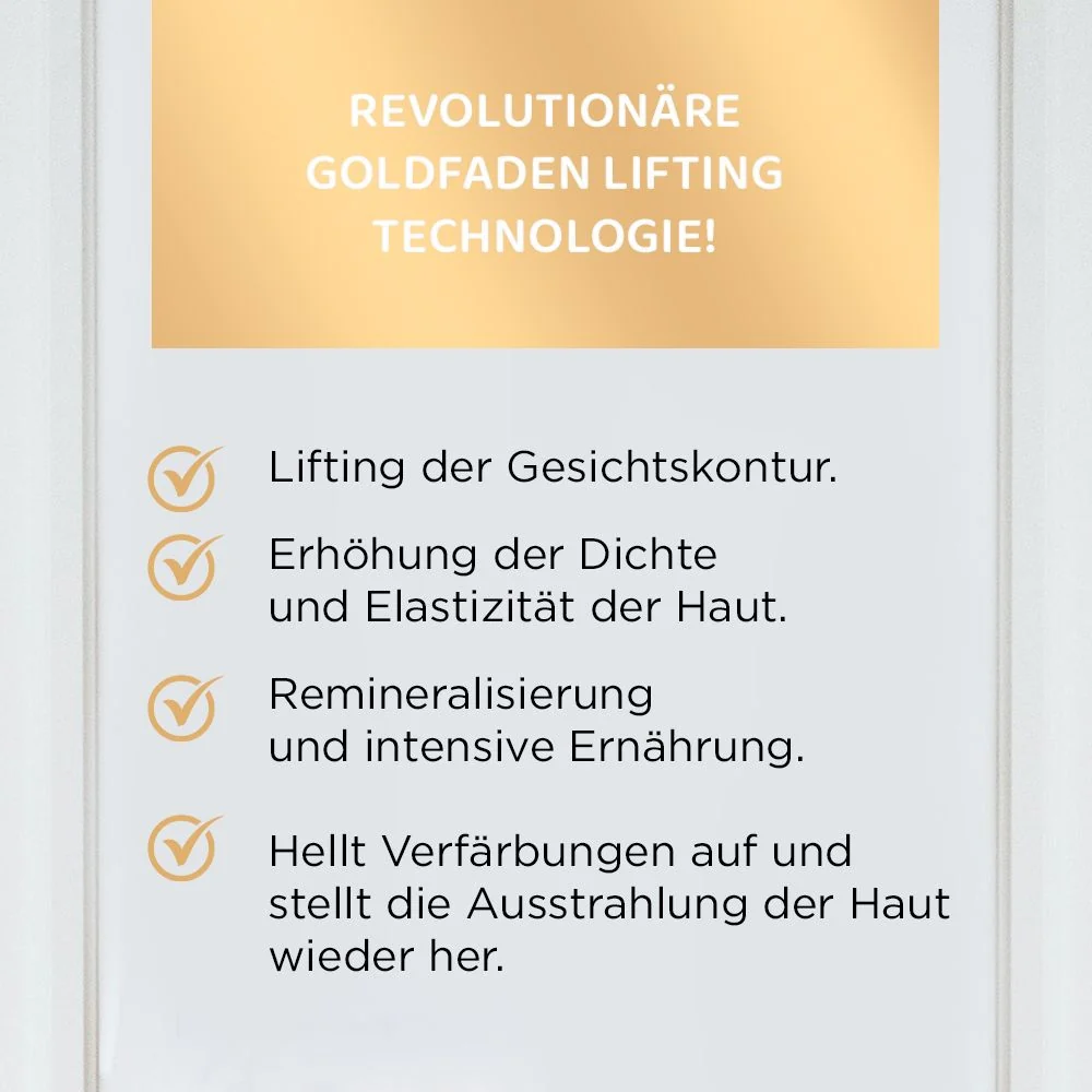 Revolutionäre Technologie goldener Lifting-Fäden für sichtbar glattere, festere und jünger aussehende Haut. Die 24k GOLD THERAPY 4D™ stimuliert die Kollagen- und Elastinproduktion und reduziert Falten bereits ab der ersten Anwendung. Konzentrierte Anti-Age-Komplexe mit Kombuchka™, Centella Asiatica, Laminaria-Algen und Hyaluron 4D sorgen für ein intensiv gestrafftes, gefestigtes Erscheinungsbild. Ideal für reife, trockene und empfindliche Haut.